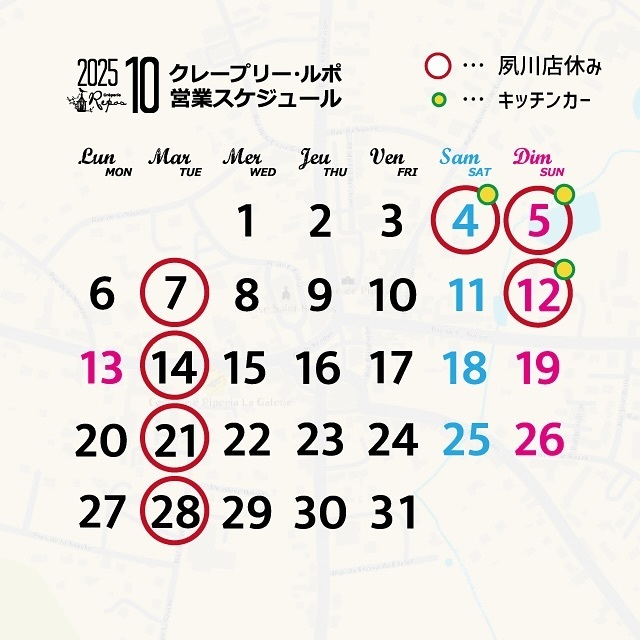 10/13(月祝)まで、ランチ・カフェ営業(16:00まで)となります。ディナーはキッチンカーの仕込みや準備、整備のためお休みさせていただきます。