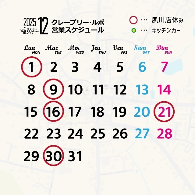 1日(月)、9日(火)、16日(火)、21日(日)、30日(火)となります🎄